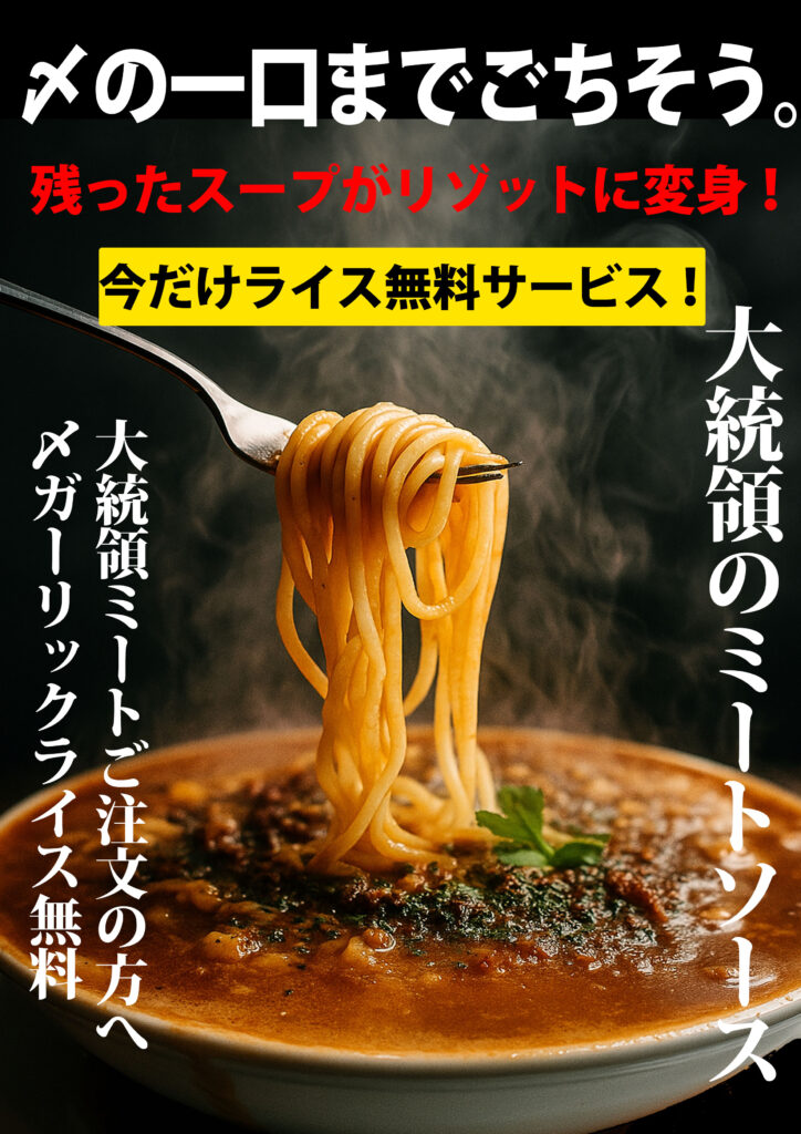 4種の異なったソースを濃厚なミートソースで荒々しくも繊細にまとめ上げ「もう一度食べたい」とご好評をいただいている、濃厚ミートのスープパスタ