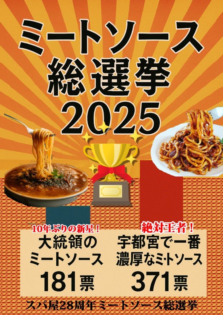 お待たせいたしました! 【ミートソース総選挙🔥結果発表!】 ◆ 優勝: 宇都宮で一番濃厚なミートソース (371票)◆惜敗: 大統領のミートソース (181票) 流石20年間スパ屋のセンターに立ち続けた王者です。 でも!寒くなるほど本領発揮🔥 この冬は 大統領のミートソース が主役! ぜひ応援よろしくお願いします✨ ◆投票時にお渡しした投票券は本日より (.)黄紙⇒¥200金券 (.)赤紙⇒大統領ご注文時にリゾット用ライス無料 サービス券としてお使いください。 ※12月31日まで両スパ屋で有効 ※お一人様1枚まで他サービスとの併用不可です。