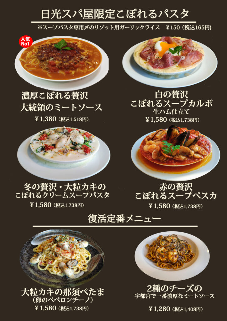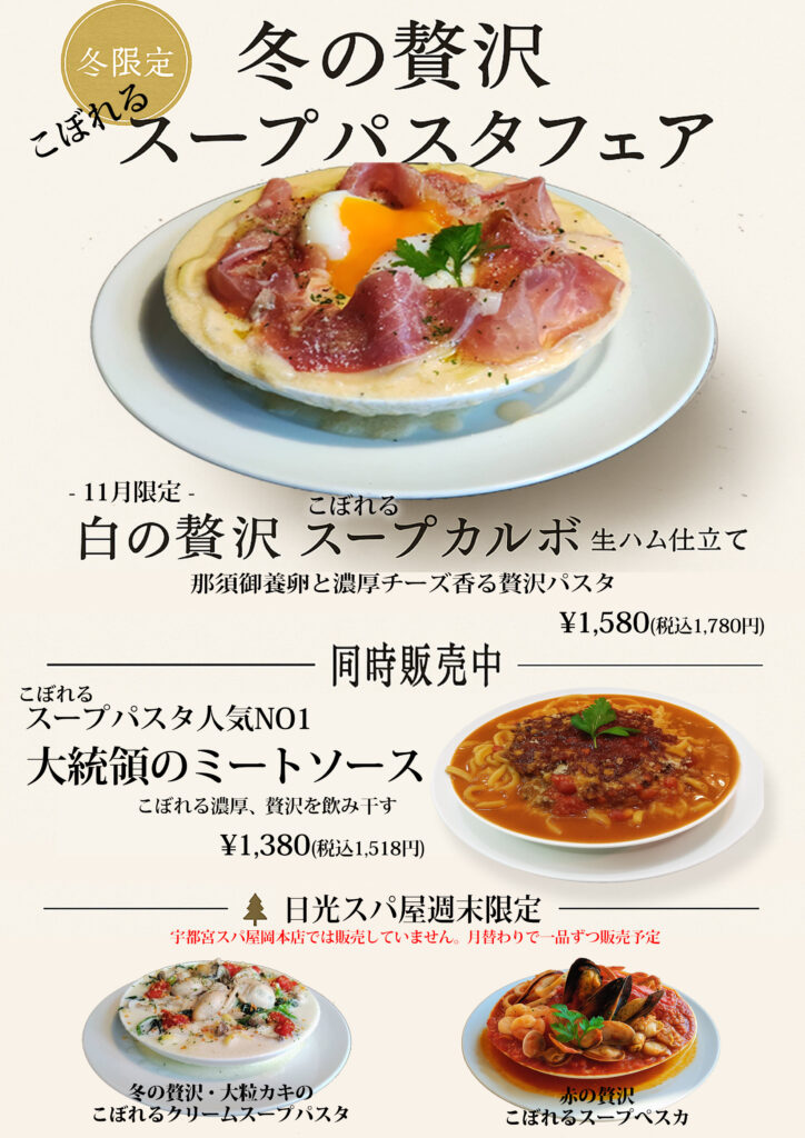 『宇都宮スパ屋』では月ごとに限定1種類を毎日ご提供しております。こぼれるスープパスタ人気No1の「大統領のミートソース」も併せて冬のこぼれるスープパスタをお楽しみくださいませ。