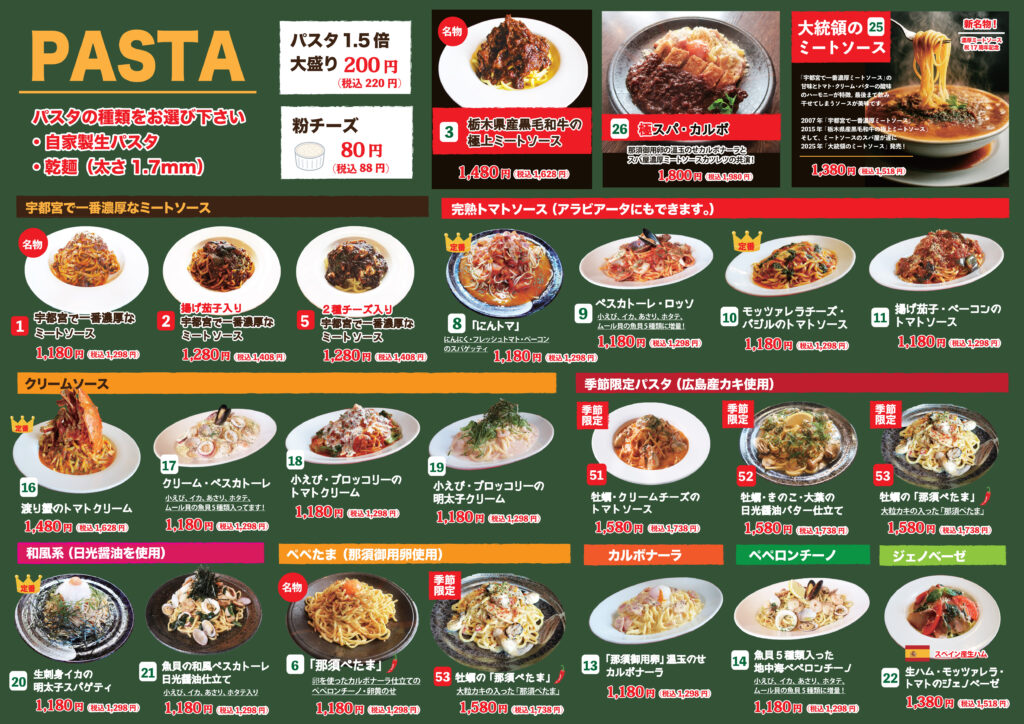 今までパスタメニューが厳選10種類で提供していましたが、お客様のご要望により全28種類の古ラインナップでご提供いたします。日光スパ屋でしか楽しめない【こぼれるスープパスタシリーズ】もございます。ご利用お待ちしております。