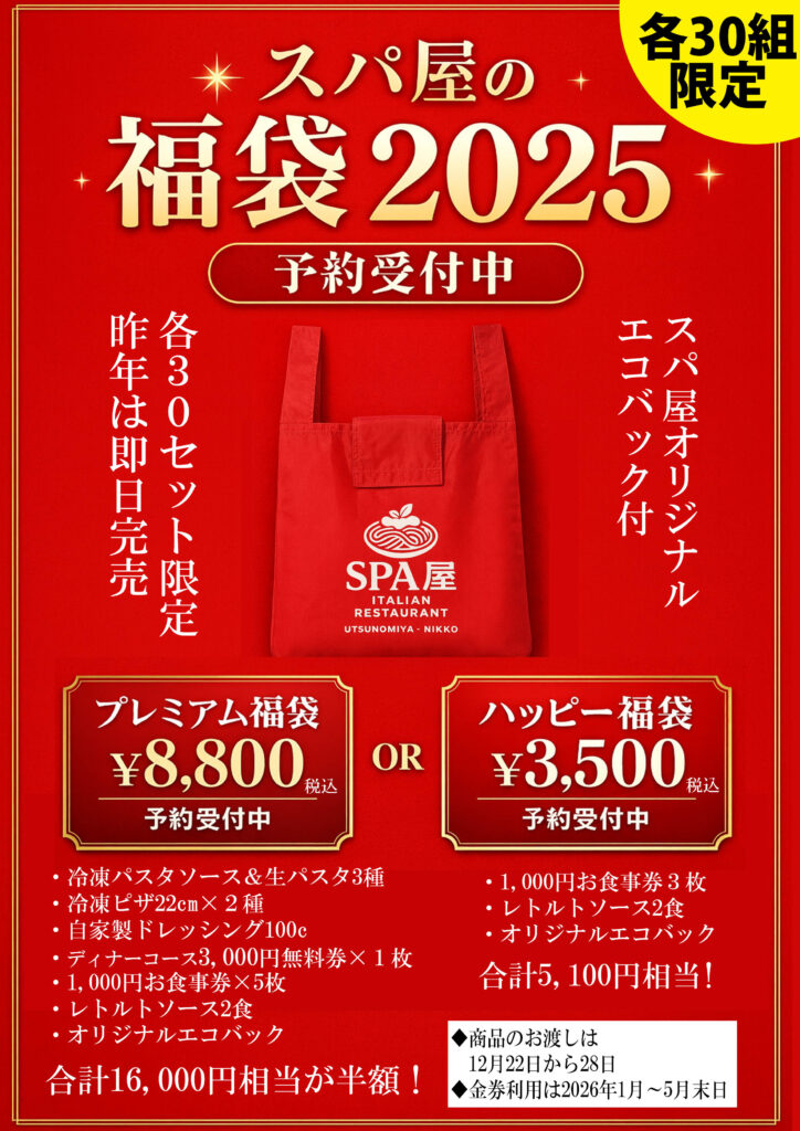 毎年売り切れ必至のスパ屋の福袋、今年は2種類で各30セット限定で販売いたします。12月15日16時より宇都宮スパ屋岡本店で電話にて受付スタートです。宇都宮スパ屋岡本店 ☎0280673-5081お電話お待ちしております。