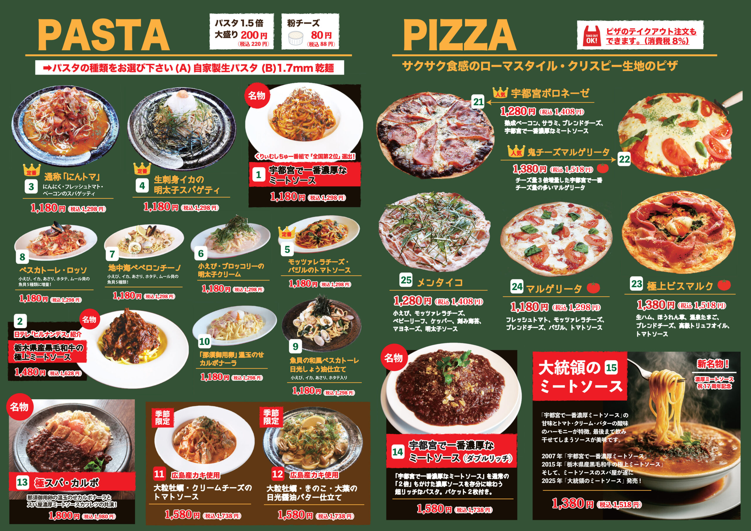 宇都宮で一番濃厚なミートソースをはじめ、自家製ソースを使ったこだわりパスタをお気軽にお楽しみ下さい。