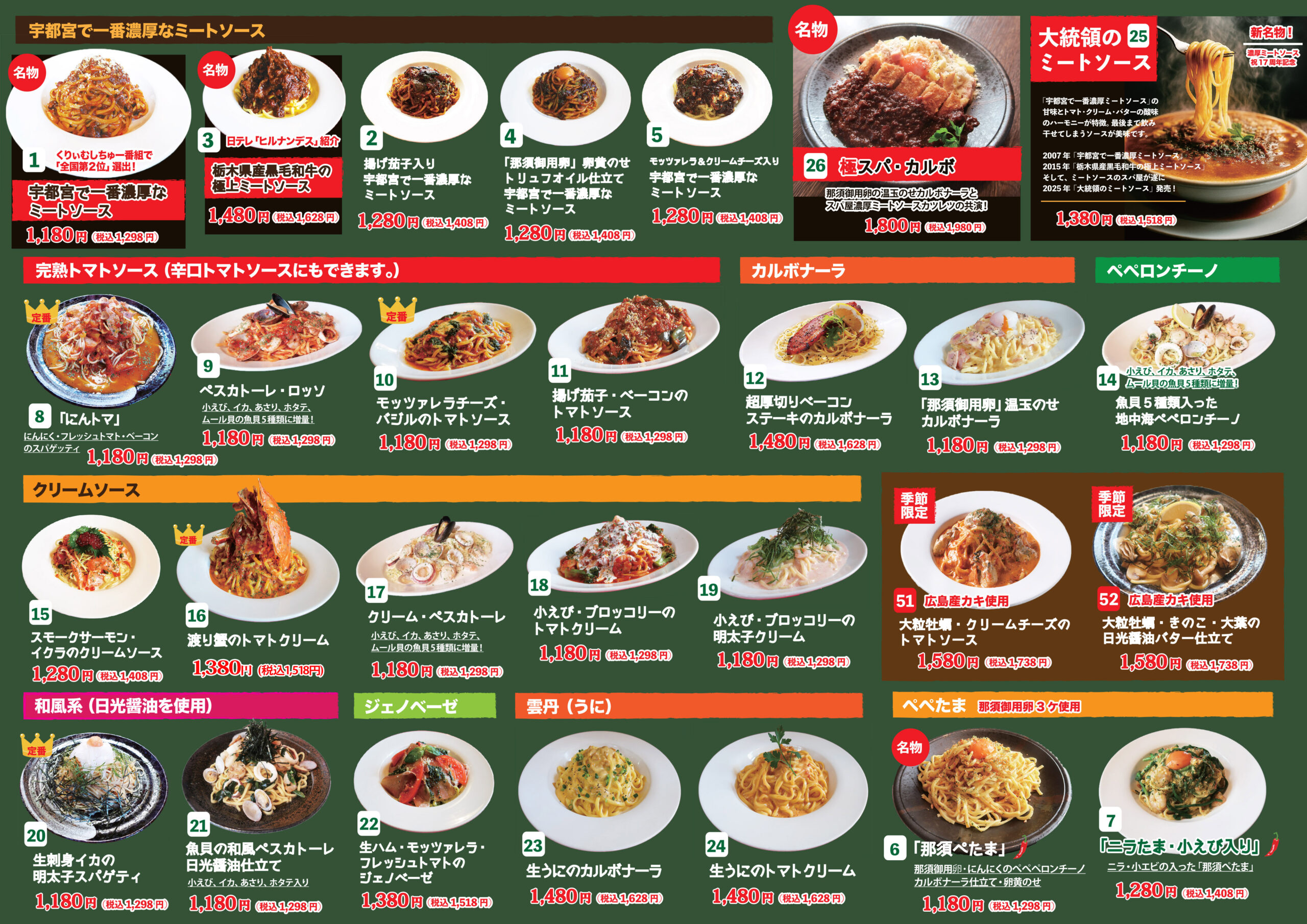 日本テレビ・テレビ東京やラジオなど多数のメディアで紹介された宇都宮で一番濃厚なミートソースをはじめ、人気パスタや話題の前菜メニューを多数ご用意しております。